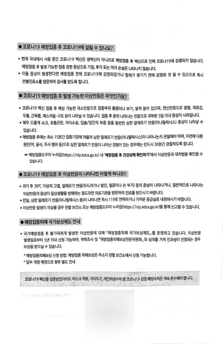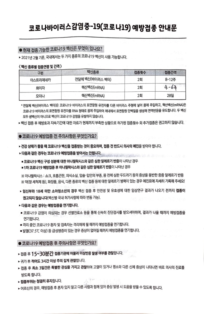 병원에 가려고 받은 서류의 대략적인 내용은 코로나 백신 접종 후 알레르기 반응이 나타날 수 있음 코로나 감염이 의심되면 백신 접종이 늦어짐 코로나 백신 접종 후 경과를 알기 위해 30분 정도 병원에서 기다리고 있음 코로나 백신 접종 후 이상 반응