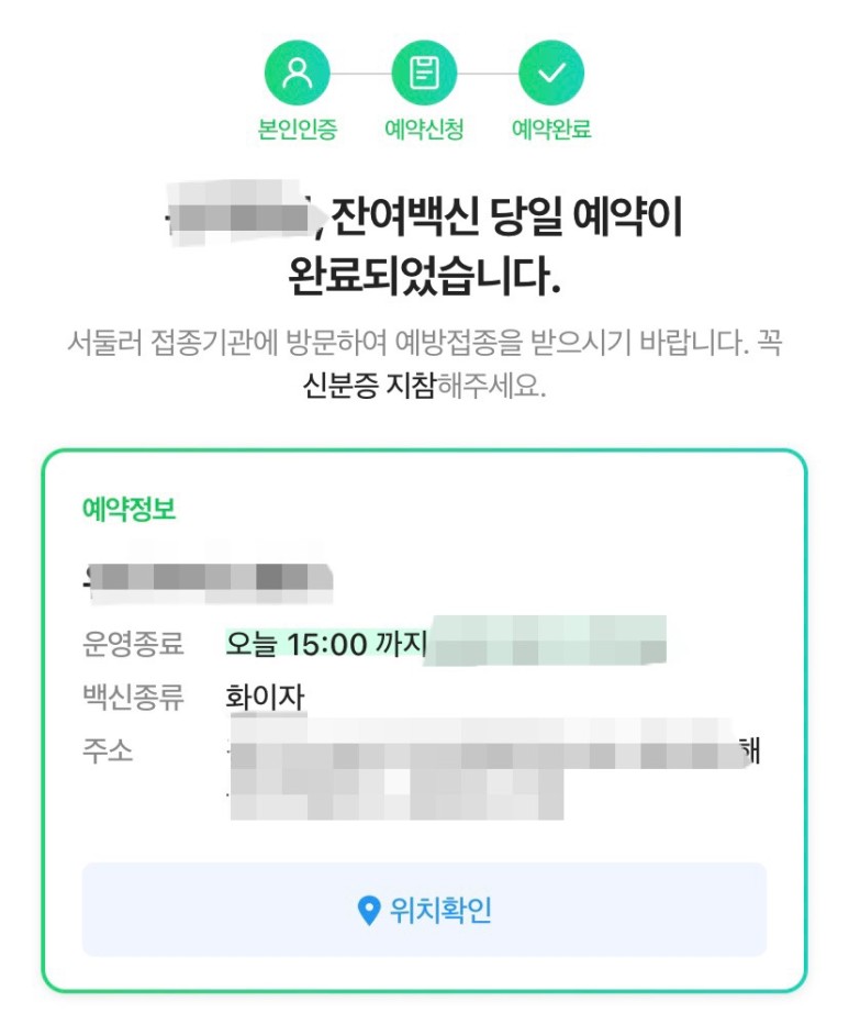 유유히 핸드폰 도중 네이버로 예약해 놓은 나머지 백신 당일 예약 알림이 떴고 0.00001초만에 누른 결과 1차 남은 백신으로 화이자 예약에 성공했습니다!
