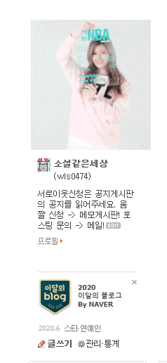 모바일 버전 포스팅에 있는 제 프로필을 보면 이렇게 이달의 블로그라는 꼬리표가 붙었습니다.(프로필 밑에 수상내역은 그대로 남아 있지만 프로필 사진 옆의 꼬리표는 다음 달 15일이면 사라진다고 합니다)