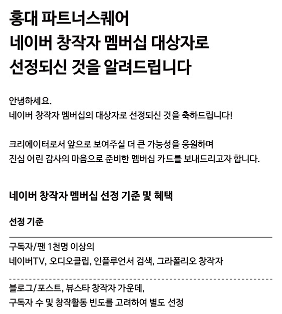 홍대 파트너스퀘어네이버 창작 멤버십 대상 선정 소식을 알려드립니다네이버를 이용하는 스몰 비즈니스와 창작자에게 성장을 위한 다양한 교육과 공간을 제공합니다.partners.naver.com 홈페이지에 들어가서 세부 내용을 보면 창작자가 원활한 창작활동을 할 수 있도록 시설이나 장비 등을 대여해 주고 교육도 실시하고 있다고 합니다.