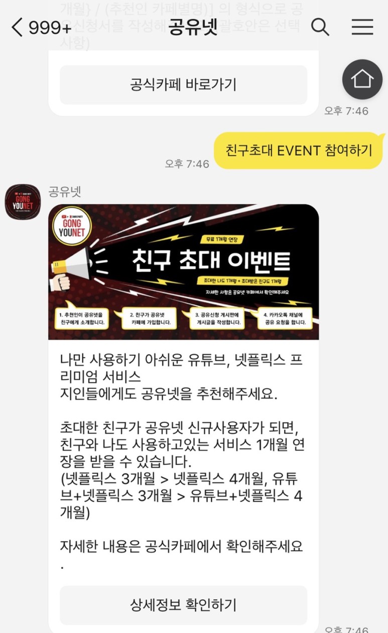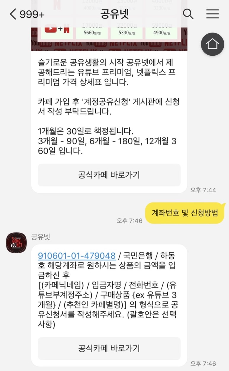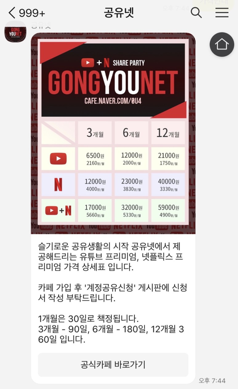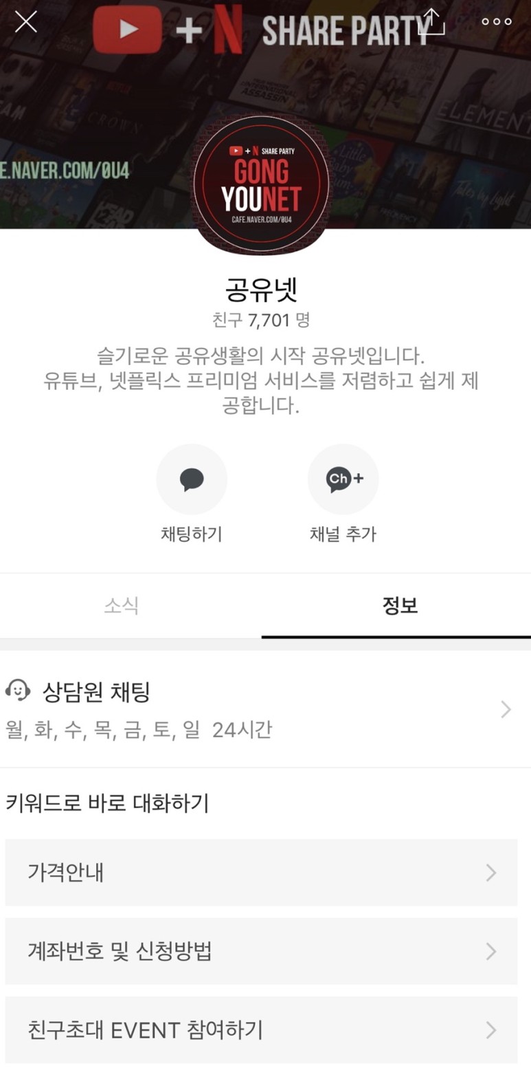 3개월 동안 잘라도 월 5660원 정도 되니까 정말 부담 없겠죠?슬기로운 공유생활의 시작 공유넷입니다. 유튜브, 넷플릭스 프리미엄 서비스를 저렴한 가격에 쉽게 제공합니다. pf.kakao.com 상단의 링크를 클릭하시면 카카오톡으로 연결돼 자세한 내용을 설명하실 수 있습니다.