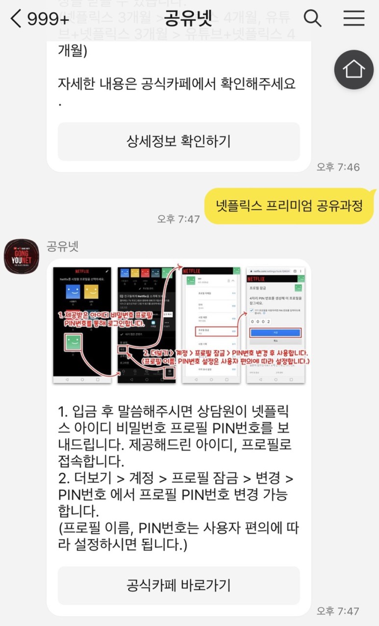 넷플릭스, 유튜브 프리미엄 공유 과정도 카카오톡으로 굉장히 친절하게 알려주십니다.