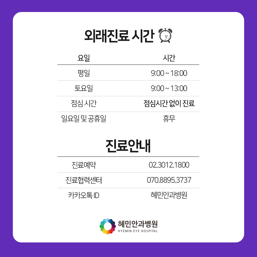 혜민안과병원에서는 급성폐쇄각,녹내장 각 분야별로 담당하는 의료진 분들과 함께 김안과 병원장 경력을 가지고 있는 손영호 대표원장까지 함께 1:1 맞춤진료로 보고 있으니 참고하시고 내원해주세요:)