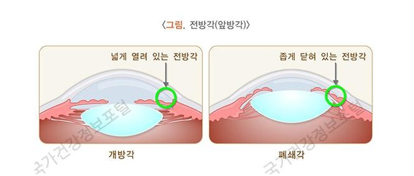 각막의 뒷면과 수정체 사이에는 앞쪽이라고 불리는 방수가 채워진 투명한 공간이 있으며, 이 방수는 눈 속을 채우는 액체로 눈 모양을 유지하고 안구 내부에 영양을 공급하는 역할을 합니다.전방각의 공간이 넓은 것을 개방각이라고 하며, 공간이 좁거나 닫히거나 해서 방수가 빠지기 어려운 것을 폐쇄각이라고 합니다.폐색각의 경우 일부 레이저 치료를 통해 약간의 예방도 가능합니다.