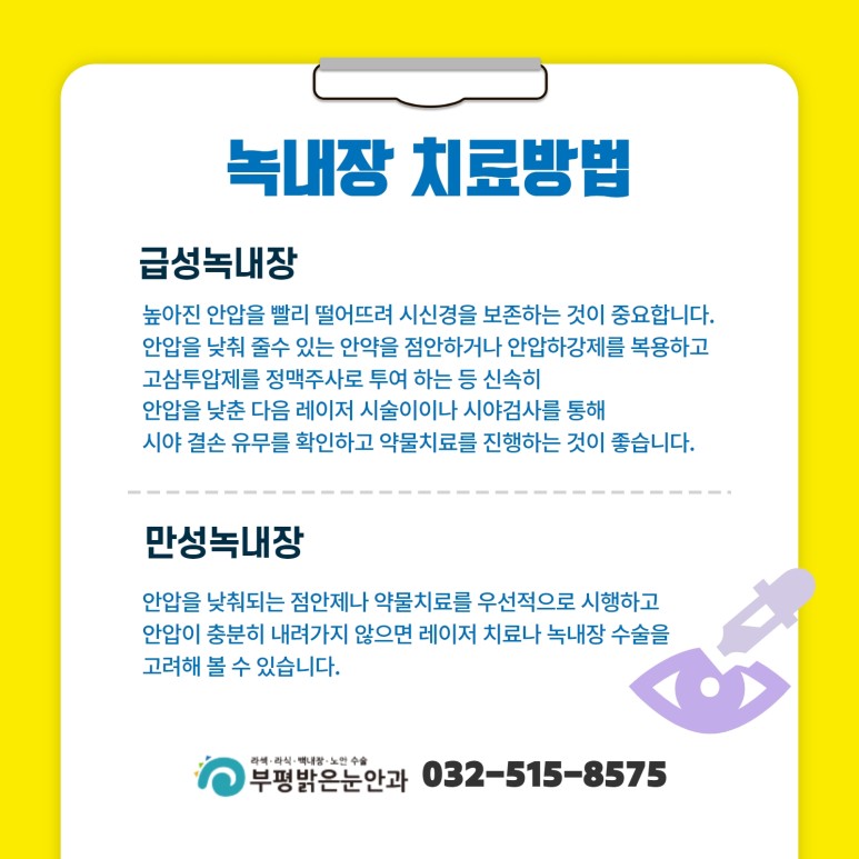 급성 녹내장의 경우는 높아진 안압을 빨리 낮추고 시신경을 보존하는 것이 중요합니다. 따라서 안압을 낮추는 점안하거나 안압하강제를 복용하고 고삼투압제를 링거로 투여하는 등 신속하게 안압을 낮추고 레이저 시술이나 시야검사를 통해 시야결손 여부를 확인하고 약물치료를 하는 것이 좋습니다. 만성의 경우 안압을 낮추는 점안제나 약물치료를 우선적으로 실시하고 안압이 충분히 떨어지지 않는 경우 레이저치료나 녹내장수술을 고려할 수 있습니다.