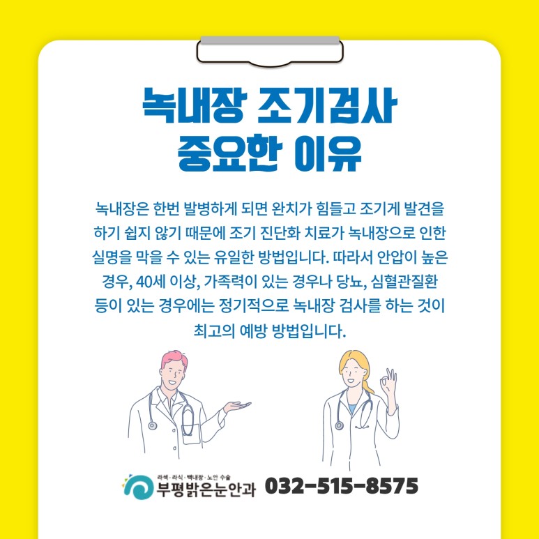 급성 녹내장인 경우에는 두통, 구토 등을 동반하면서 통증이 심하기 때문에 즉시 병원이나 응급실을 찾을 수 있는 방광에 만성 녹내장인 경우에는 증상이 뚜렷하지 않고 천천히 진행하기 때문에 증상이 뚜렷한 경우에는 이미 말기이므로 치료가 어려운 경우가 많습니다. 따라서 정기적인 녹내장 검사로 조기 발견과 치료가 매우 중요합니다.