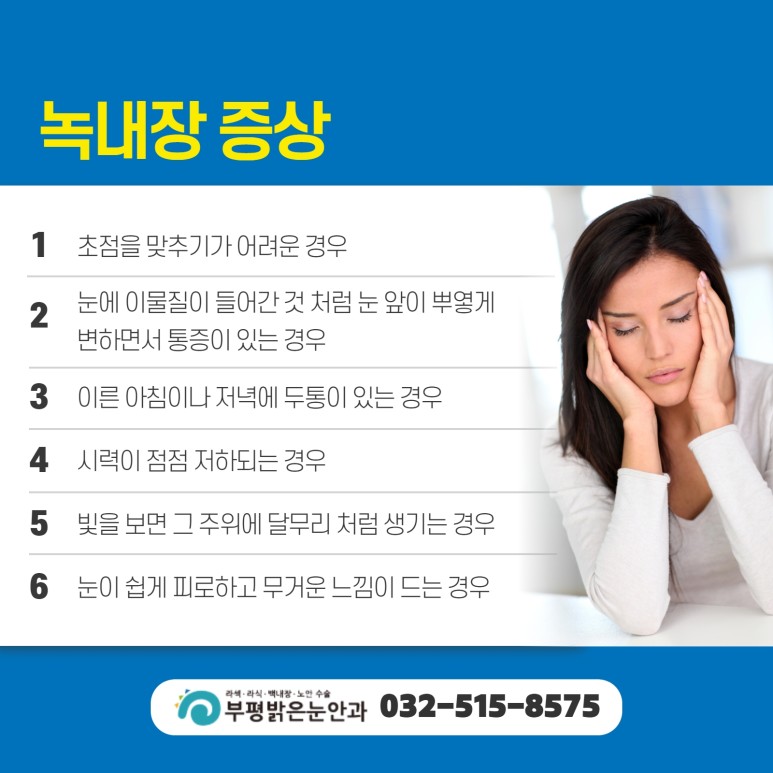 - 초점을 맞추기 어려운 경우 2. 눈에 이물질이 들어간 것처럼 눈앞이 흐릿하고 통증이 있는 경우 3. 이른 아침이나 저녁에 두통이 있는 경우 4. 시력이 점점 저하되는 경우 5. 빛을 보면 그 주위에 달처럼 보이는 경우 6. 눈이 쉽게 피로해지고 무거운 느낌이 드는 경우