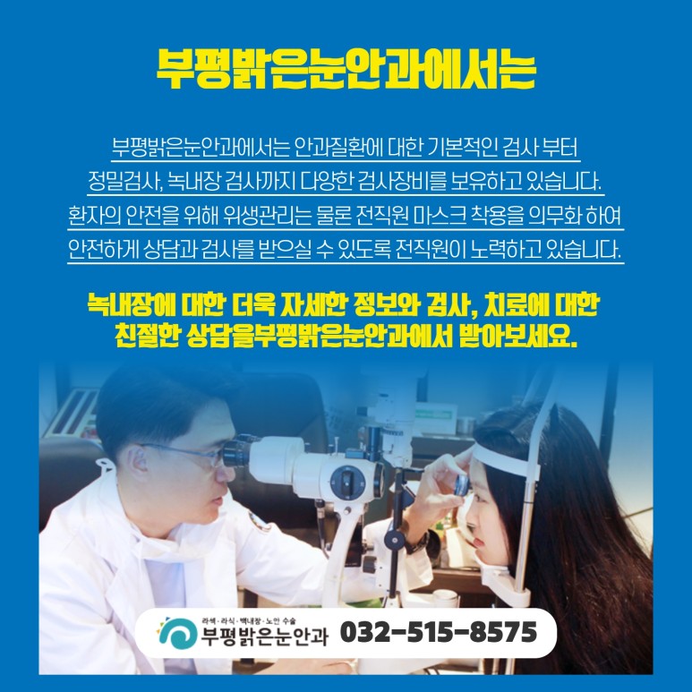인천안과에서는 안과 질환에 대한 기본적인 검사부터 정밀검사, 녹내장검사까지 다양한 검사장비를 보유하고 있으며, 환자의 안전을 위하여 위생관리는 물론 전 직원에게 마스크 착용을 의무화하고 있으므로 안전하게 상담과 검사를 받을 수 있도록 전 직원이 노력하고 있습니다. 녹내장에 관한 보다 자세한 정보와 검사, 치료에 관한 친절한 상담을 부평밝은안내과에서 받아보세요.