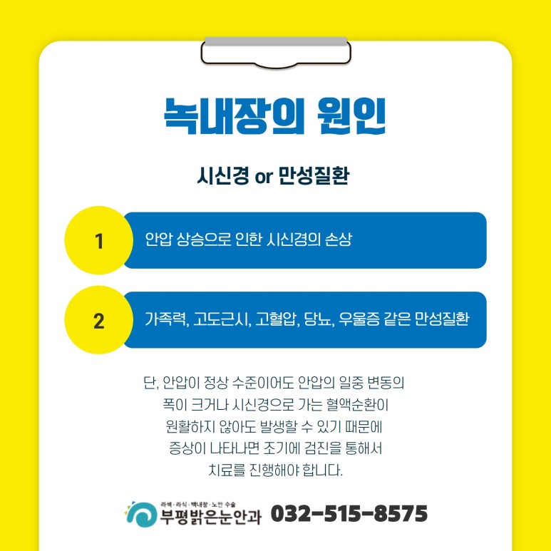 안압이란 안구의 형태를 유지하는 눈의 압력을 의미하는데, 눈의 형태를 유지하기 위해서는 적절한 안압이 유지되어야 하는데, 안압이 상승하면 이 방수가 적절히 분리되는 능력이 저하되어 방수의 생산과 배출이 불균형을 이루어 시신경을 압박하여 시신경으로 흐르는 혈류를 저하시키고 시야 손상이 진행됩니다.