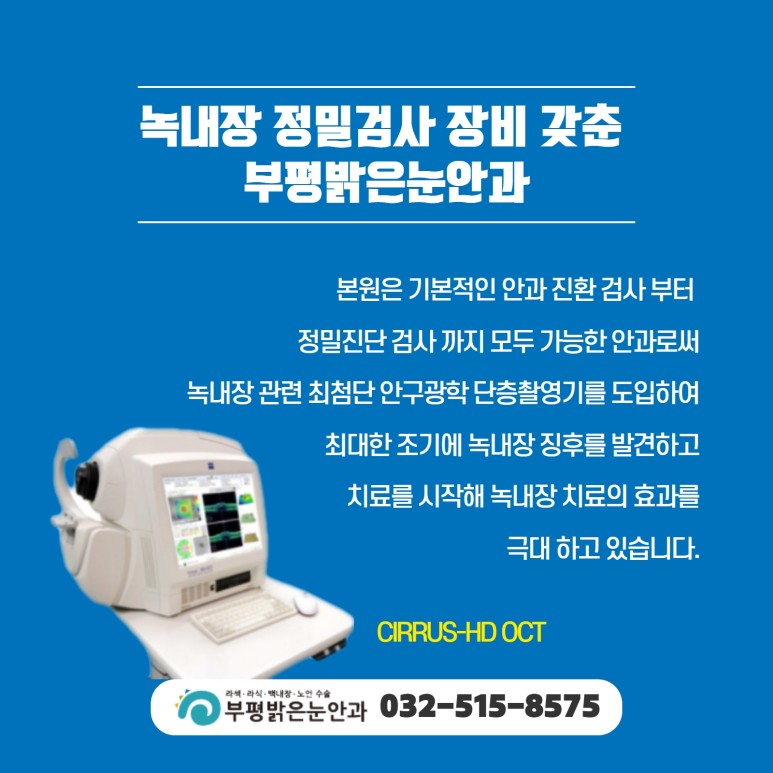 인천안과 본원은 기본적인 안과 진환검사부터 정밀진단검사까지 모두 가능한 안과로서 녹내장 관련 진단장비를 파괴한 회사인 독인carlzeiss사의 안구광학단층촬영기를 도입하여 최대한 조기에 녹내장 징후를 발견하고 치료를 시작하여 녹내장 치료의 효과를 극대화시키고 있습니다.