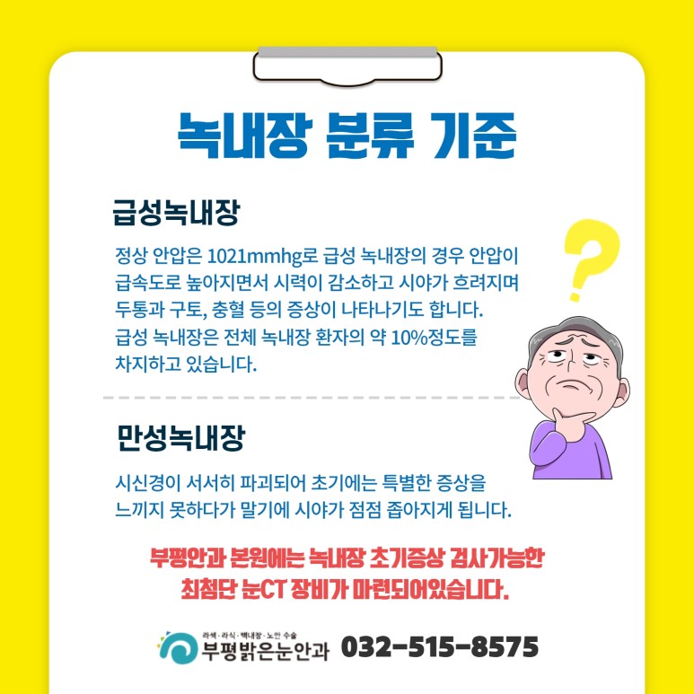녹내장을 분류하는 기준은 다양하지만, 크게 급성과 만성으로 나눌 수 있으며, 그에 따라 증상이 다를 수 있습니다. 정상 안압은 1021mmhg이며 급성 녹내장인 경우 안압이 급속히 높아짐에 따라 시력이 저하되고 시야가 흐려져 두통 구토 충혈 등의 증상이 나타날 수 있습니다. 급성 녹내장은 녹내장 환자 전체의 약 10 %를 차지하고 있습니다.