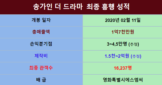 요약정보 : 장편영화 ㅣ 공연실황 ㅣ 82분 ㅣ 전체관람가 ㅣ 한국감독 : 이태술, 김성윤 출연 : 송가인 배급 : 송가인 배급 : 영화특별CMC 영화 《송가인 더 드라마》, 《후기》, 《단독콘서트》, 《가인 이올라》 공연실황