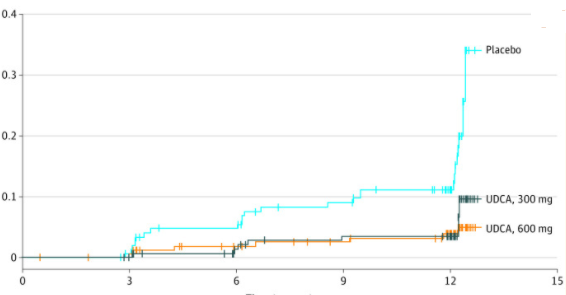 Ursodeoxycholic Acid 논문 위에서는 UDCA, 즉 을사정(Ursodeoxycholic Acid)을 복용한 그룹과 복용하지 않은 그룹(placebo)을 비교한 논문입니다. 그래프를 보면 복용하지 않는 그룹보다 복용한 그룹이 담석 형성률이 낮은 것을 볼 수 있습니다. 논문을 구체적으로 살펴보면, 을사정 300mg과 600mg 복용 그룹 모두 가짜 약 그룹(placebo)에 비해 높은 담석 예방 효과를 보였습니다. 이 논문의 결과는 을사정(Ursodeoxycholic Acid)이 담석증, 담석증 예방에 효과적임을 시사합니다.