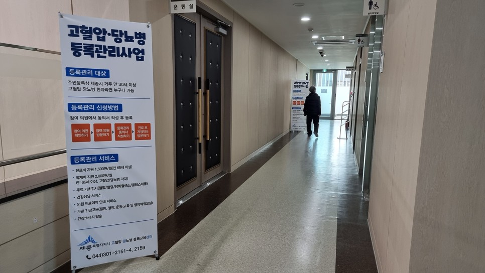 주차장에서 바로 연결되는 본관 2층에는 세종특별자치시 고혈압 당뇨병 등록교육센터가 있습니다.고혈압당뇨병등록교육센터는 만 30세 이상 고혈압, 당뇨병 환자와 가족, 시민을 대상으로 기본검사 및 교육상담, 영양체험 등을 실시하고 있으며, 특히 만 65세 이상 시민에게는 진료비와 약제비 지원사업을 실시하고 있습니다.
