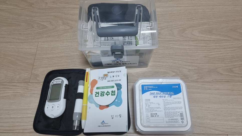 바로 혈당 체크도 해 주더라고요.집사람은 정상이지만 전 역시 주의 단계예요.집에서 혈당 검사하는 방법을 알려 주시고, 무료로 기기를 3개월간 임대해 주셨으며, 검사에 필요한 도구도 상자에 넣어 주셨어요.