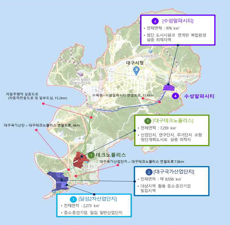 실증인프라는 수성알파시티를 비롯하여 테크노폴리스, 대구국가산업단지, 달성2차 일반산업단지 도로교차로 등에 구축될 것으로 알려지고 있습니다.