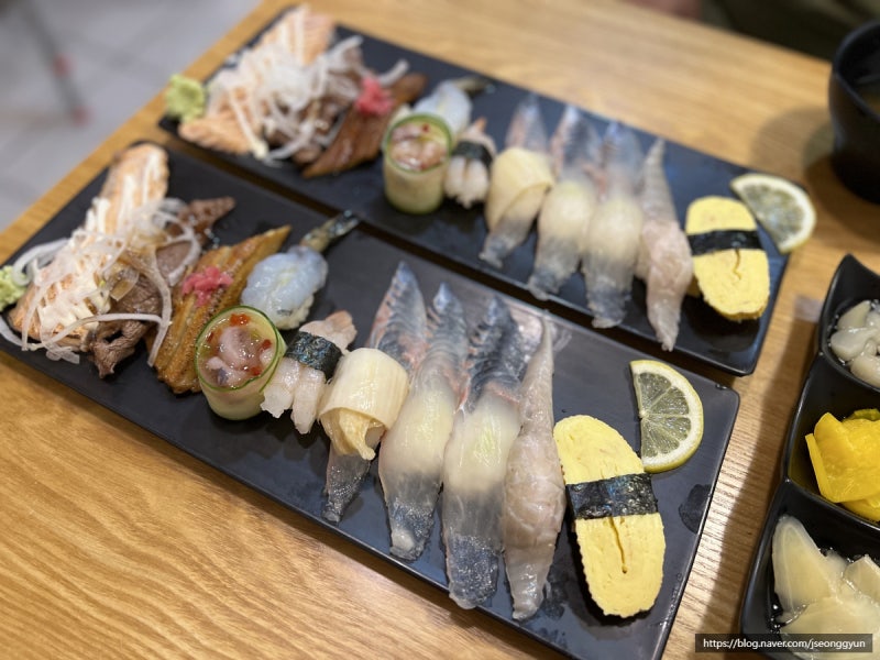 요즘 이런 곳이 많거든요. 어쩔 수 없죠.연어 뺀 것도 본 기억이 납니다. 눈물 눈물대전초밥집 노은동 초밥전 메뉴와 가격 – 저희는 초밥전 세트로 2인 주문했습니다.골고루 먹고 싶을 때 최적의 메뉴입니다.연어는 여러분 아시다시피 요즘 물가가… 전쟁 때문에 공급이 힘들어서 많이 올랐어요.테이크아웃 주문 시에는 계란찜과 우동 대신 초밥 1pc가 추가라고 합니다.반찬은 연어와 곁들여 먹는 토마토 치즈 샐러드? 레몬갈릭 소스가 곁들여진 듯한 기본 야채샐러드, 된장국, 생강절임/단무지/락교, 계란찜이 준비됩니다. 조금 먹고 있으면 초밥이 늦지 않기 때문에 입안을 치우는 김에 먹으면 딱 좋아요. 기다리는 시간을 지루하지 않게 해주는 아이들이에요.차가운 토마토 안에는 치즈가 또 있어요.거기에 연어 샐러드를 올려 먹을 거예요.오나정이 잘 어울리는 조합입니다.찹스테이크 소스? 똑같은 게 매력적이야!초밥전 세트 2인초밥전 세트 2인스시다세트구성 : 총11pcs/광어4,연어1,쇠고기1,장어1,새우1,연어사비1이 기본으로 계란초밥1,새우1이 추가된 세트입니다.아주 다양하게 즐길 수 있는 종류로 구성되어 있습니다.딱 봐도 회소가 두껍고 길쭉하잖아요. 나는 이렇게 밥알이 작고 회가 두꺼운 것을 좋아해요. 너무 밥이 많으면 회 맛이 별로 안 느껴져서. 그런데 전에 사장님께서 음식을 갖다주시면서 한번 말씀해 주셨는데 쌀알 크기는 미리 말씀드리면 크게도 해주신다고 하더라고요. 취향에 맞게 즐겨주세요. (웃음)맛있는건 더 가까이서 :)평소에는 좀처럼 맛볼 수 없는 초밥을 만날 수 있습니다.체력을 보강할 수 있는 재료들로 구성되어 있습니다.이것은 광어 안심으로 만든 초밥입니다.광어회는 무조건 지느러미가 있어야 해요.회를 먹을때도 지느러미에 푹빠지는 ㅋㅋ 고소하고 식감이 쫄깃쫄깃한 그 자체입니다.광어만으로도 맛있는데 묵은지라니! 산뜻하게 입맛을 돋우는 느낌이 들어요.아삭아삭한 식감에 새콤달콤한 것이 매력입니다.소고기도 연어도 재료가 신선해서 그런지 충분히 맛보면서 먹기 딱이었어요. 어디라고 밝힐 수는 없지만 조금씩 비린 맛이 나서 빨리 씹어 버리고 싶은 곳도 있거든요. 그런 곳에 비하면 여기서는 먹을수록 행복해지는 맛이에요. 초밥 하면 저는 정말 여기예요.우동도 그냥 우동이 아니에요. 초밥은 아무리 신선해도 먹고 아무래도 조금 속이 더부룩해지는 타이밍이 있잖아요. 느낌 알죠?이런 청양고추 들어간 매콤우동 하나면 끝이에요. 그렇다고 그렇게 맵지도 않고 시원하게 먹을 수 있을 정도였어요. 국수도 알맞게 구워져서 맛있게 완성했네요.제 돈의 내산 인증을 겸해서 다시 영수증을 찍었네요.언제 가도 정말 맛있어서 기분좋게 먹고 나와요.꼭 여기 사시는 분이 아니어도 추천드립니다.조금 멀리 가서 먹어도 후회 없을 거예요.주차장도 잘 되어 있으니 친절하고 깔끔한 맛있는 초밥을 드셔보세요.정기적으로 가는 초밥집이라 후기도 가끔 적을게요. 맛있는 곳은 리뷰를 자꾸 남기실 거예요. 대전 유성 부근 혹은 대전에서 초밥 맛집을 찾으시는 분들께 추천드리는 맛집입니다. 저는 여기서 가까이 살아서 너무 좋네요. 집 근처에 맛있는 곳이 있다는 것 자체도 큰 행복이 아닐까요? 여기서 마치겠습니다. 크크.초밥전 대전광역시 유성구 노은로 174 도원플라자초밥전 대전광역시 유성구 노은로 174 도원플라자초밥전 대전광역시 유성구 노은로 174 도원플라자초밥전 대전광역시 유성구 노은로 174 도원플라자