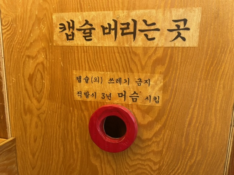 그리고 빨간 캡슐은 송아지라서 생긴 캡슐, 버리는 곳에 버리면 돼근데 이 구멍에 쓰레기 넣는 사람이 많은 것 같아. 적발 시 3년 하인으로 보냈다.