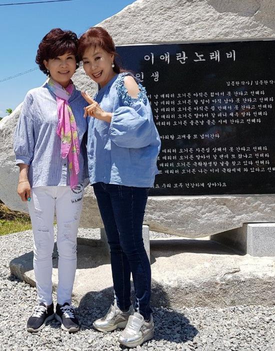 오른쪽 사진의 이애란(오른쪽)은 강원도 홍천에서 자랐다. 모교 홍천남면 매산초등학교에 노래비가 세워졌다. 사진은 노래비 앞에서 동료 가수 나윤정(왼쪽)과 함께. / 스타월드 기획제공 이애란 프로필 본명 이은옥 출생 1963년 3월 25일 (58세) 강원도 홍천군 학력 양덕상업고등학교 (졸업) 가족아버지 이정순, 어머니 문희선 데뷔 1990년 서울뚝배기 OST 종교 무종교 소속사 스타월드 기획