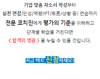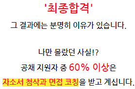 출처 : 잡코리아, 냉정하게 판단해서 자신의 스펙이 부족하다고 느낀다면?자기소개서 첨삭과 면접 코칭을 받아야 최종 합격을 알 수 있어요.