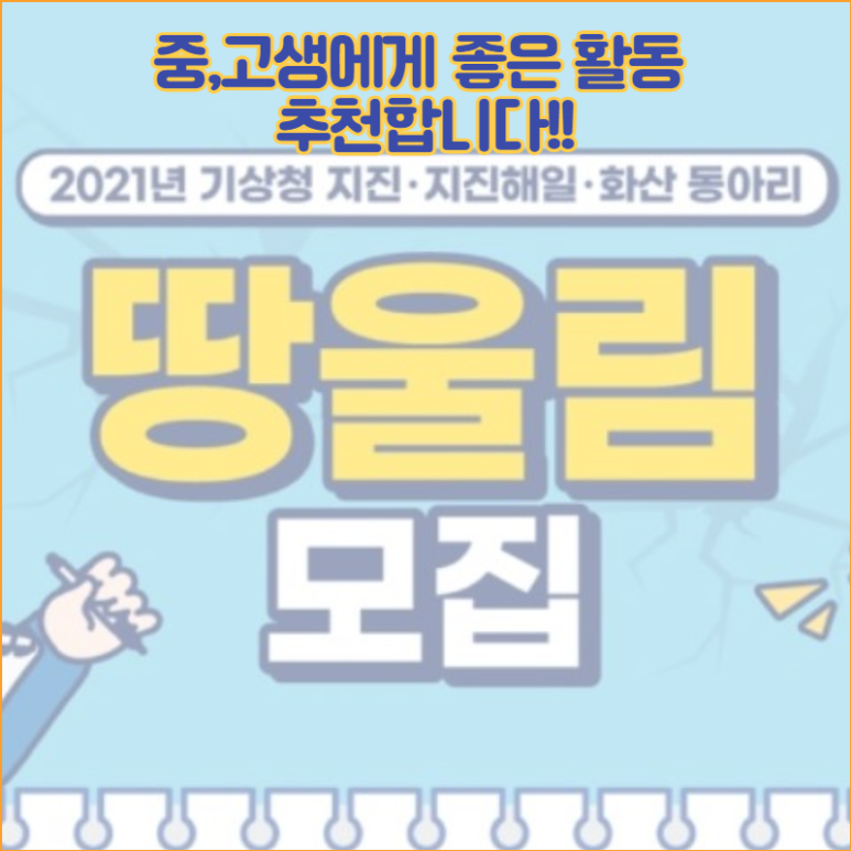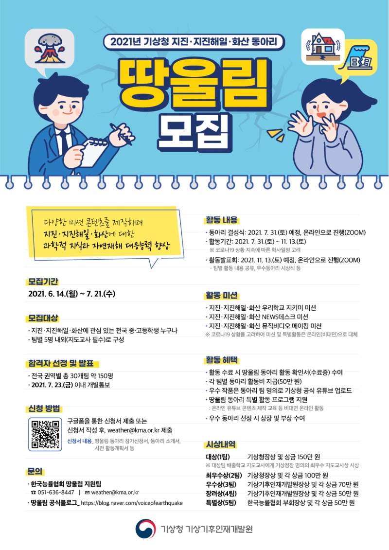 2021년 지진·지진해일·화산동아리, 땅울림, 모집공고 본청·지방청:본청 등록부서:인력개발과 2021/07/12 조회수 121 기상청은 지진·지진해일·화산동아리 ‘땅울림’에서 활동할 중고등학생을 추가 모집합니다. ※ 땅울림 : 지진·지진·해일·화산에 의한 자연재해의 위험을 인식하여 전파하고 과학적 발생원리를 자율적으로 탐구하는 동아리인 2021년 ‘땅울림’은 미래 기상과학자를 양성하고 학생들의 자율적인 활동을 지원하기 위해 다양한 프로그램을 기획하고 있습니다. 코로나 19상… www.kma.go.kr