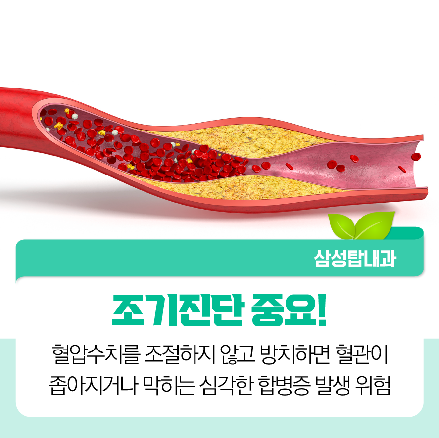 심각한 합병증 예방을 위해 조기진단이 중요!고혈압은 진단 시기도 늦어질 확률이 높고, 진단되어도 증상이 없는 치료를 하지 않고 방치해 버리는 경우가 많습니다만. 혈압수치를 조절하지 않고 방치하면 혈관이 좁아지거나 막히는 심각한 합병증이 발생할 수 있습니다.