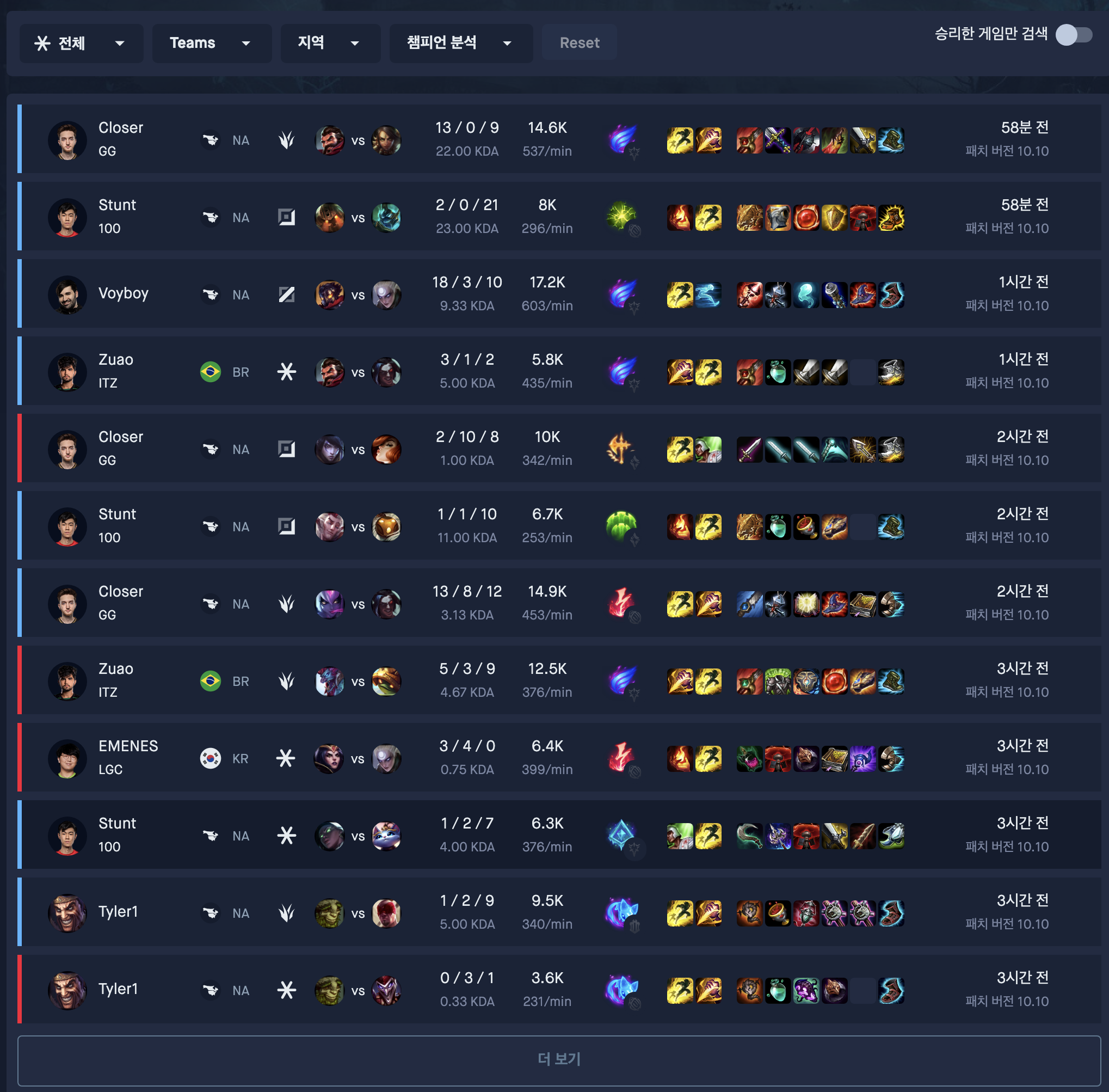 챔피언 분석으로 마지막으로 카운터에 대해 확인할 수 있는데요. 여기서는 자신이 선택한 챔피언에 대한 카운터 챔피언의 상대적 데이터를 비교 분석할 수 있습니다. 위의 예를 든 모델들은 카운터 챔피언 피오라에 비해 매치업 평균 데이터에서 약간 밀리는 것을 확인할 수 있습니다.통계