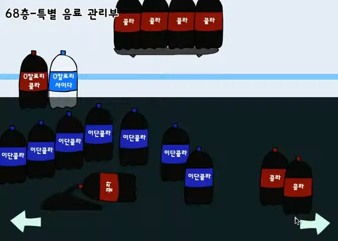 콜라가 아주 많이 준비되어 있고, 그 외에 이단콜라, 0칼로리콜라, 0칼로리사이다 등 특별한 음료가 준비되어 있음을 확인하실 수 있습니다. 과연 어떤 행동을 해야 다음으로 넘어갈 수 있을까요?