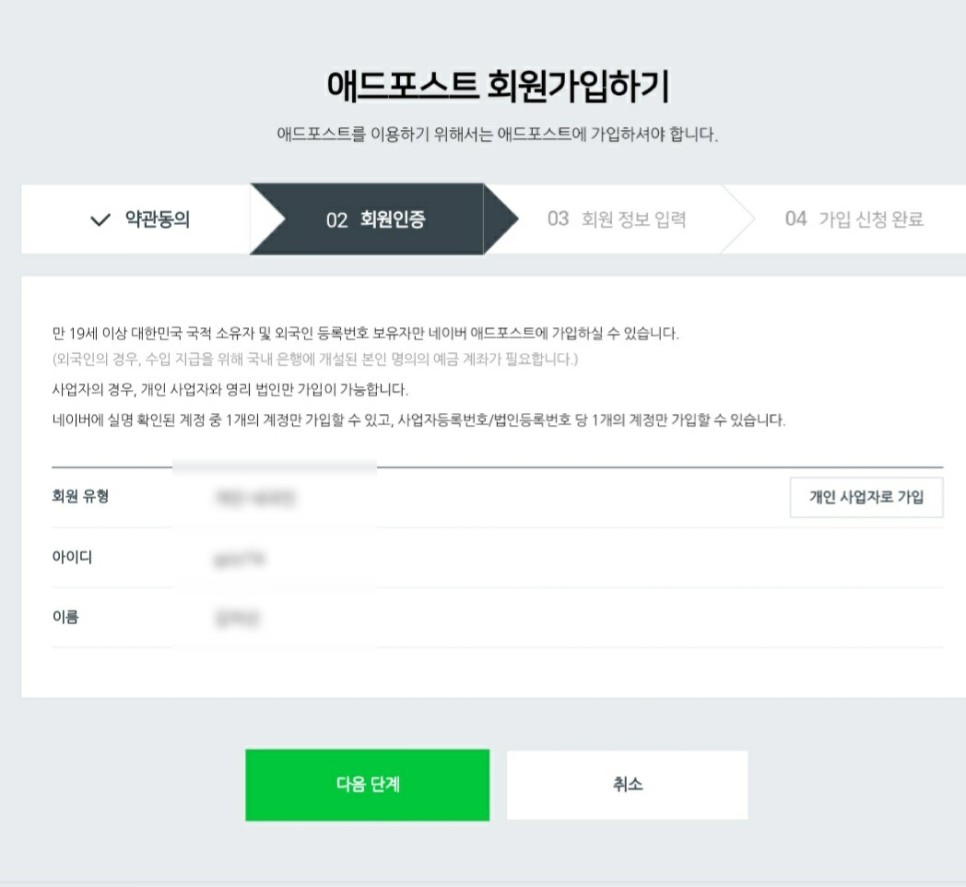 개인정보 입력 및 인증 후 다음 단계