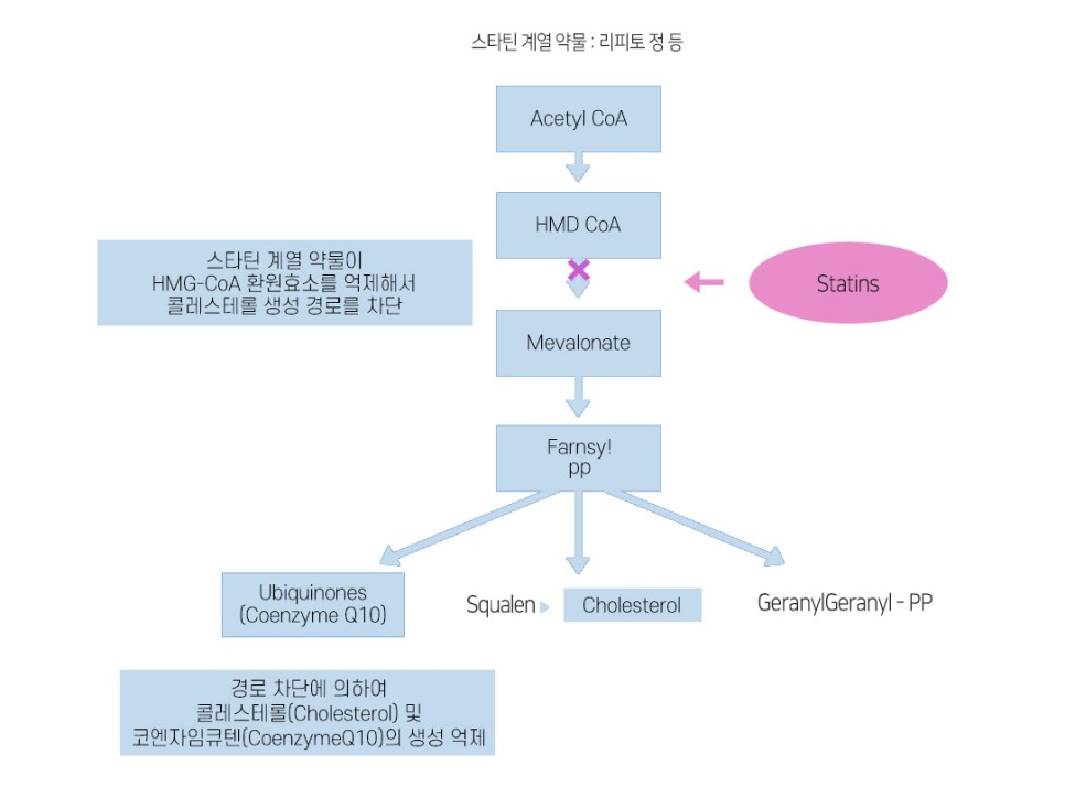 게다가 또 다른 문제는 코큐텐은 콜레스테롤이 합성될 때 생성되는 물질이기 때문에 간의 콜레스테롤 합성을 막는 스타틴 계열의 약을 먹을 때 같은 메커니즘으로 코큐텐 합성도 막는다는 건데요.
