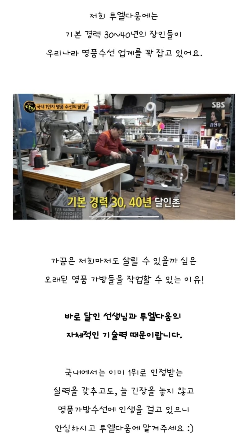 뚜엘다움 서울특별시 서초구 신반포로 320-5 1층 뚜엘뚜엘다움 서울특별시 서초구 신반포로 320-5 1층 뚜엘뚜엘다움 서울특별시 서초구 신반포로 320-5 1층 뚜엘뚜에르다움 체계적인 운영시스템의 명품전문클리닉 매장으로 명품수선사 최초로 자체 기술력으로 특허등록한 곳(특허등록:에나멜 가죽염색방법) 기본경력만 30~40년의 명품수선을 장인의 뚜에르다움만의 기술력으로 명품가방 수선 국내 1위에 실력을 인정받은 수선서비스 업체입니다!가방앞을 열고 닫으면서 앞에 금속버튼이 색변색이 너무 심한 상태였어요~ 골드컬러 대신 같은 컬러같은 상태인데 유행시 딱 사용하는 변색된 색상으로 사용하지 않았는데 옷방 정리를 하면서 수선이 가능하면 수선해볼까해서 서치해보았습니다.브랜드 수리는 여러 업체가 있지만 생활의 달인으로 나선 브랜드 수리업체가 있었습니다. 다른 곳은 내부에 전문가 없이 또 외주로 맡겨 운영하는 곳이 대부분이라 별로라고 생각했습니다. 믿음직한 곳에 가방을 맡기려고 했습니다. 경력 25년의 수선전문가와 경력 7년 이상의 염색전문가를 직접 뚜에르다음 내부에서 운영하고 있는 중이라 뚜에르다음에 제품을 수선의뢰하게 되었습니다.정면 금속 장식 도금 수선 후해외명품만 수선이 가능하며 (가품)은 진행 불가하다고 합니다 수선이 가능한 브랜드는 샤넬, 구찌, 프라다, 페라가모, 지방시, 루이비통, 발렌시아가, 셀린느 등이라고 합니다뚜엘다움과 카카오톡 상담을 통해 수선할 제품의 사진을 보내드리고 상담이 활발하게 진행된 매장 방문과 택배 접수가 가능하여 저는 카카오톡으로 상담후 택배접수를 했습니다 카톡으로 친구찾기 뚜엘 검색을 해서 친구추가를 해드렸더니 이렇게 뚜엘에서 카톡이 왔습니다 아라시 사진을 찍어서 궁금한 점 상담으로 물어보고 바클스퀘어 앞 장식만 도금하기로 결정한 후 가방에 Before 아라시 사진을 찍어두었습니다이름, 연락처, 수선의뢰부분 메모해서 가방에 붙여서 1월16일 편의점택배로 발송했어요 직접 방문하지 않고 이렇게 편하게 집에서 상담후 물건을 받아보는게 참 좋을것 같아요카카오톡에서 꼼꼼하고 상담이 원활하게 진행되는 곳이라 만족스러웠습니다. 2월16일 마무리 작업 공정중이라는 안내 카톡이 왔습니다. 2월24일 출고 카카오톡~2월25일 수선된 페이보릿이 집에 안전하게 도착하였습니다. 수선하는데는 약 한달이 소요되었습니다.에어캡포장과 다시 지퍼백 비닐에 깨끗하고 섬세한 상태로 가방이 도착했습니다.가방안쪽은 제품누름방지를 위해 에어캡을 넣어주시고 가죽스트랩까지 넣어드렸습니다 제가 의뢰한 개폐금구 장식이 새것처럼 바뀌었어요~! 설마~ 그렇게 기대는 안했는데 전문업체라 확실히 완벽하네요.귀금속 도금스크래치 방지를 위해 보호 테이프 금속에 부착된 상태로 도착했습니다.지문이 조금 있어서 휴지로 닦아줬어요 지문은 금방 없어졌어요ㅎㅎ짜잔 너무 만족해요 골드색 스퀘어 버클 찬란하네요.기존 디테일 부분의 금속 스트랩과 연결고리와 다소 색상 차이는 있지만 아직 도금 단계가 아니라서 조금 더 사용하다가 색상이 변색되면 스트랩끈과 연결고리도 투엘다움으로 도금 의뢰를 맡기려고 합니다~그동안 자주 사용했지만 금속 버클은 이염이 심해서 구석에 틀어박혀 있던 루이비통 페이보릿을 재생했네요 계절이 지나거나 유행이 지나도 상관없이 이제는 어울리는 옷에 깔끔하게 매치해 사용하려고 합니다 가방, 신발, 강아지가 물어뜯은 운동화, 핸드백 등 물에 젖어서 색이 변색된 것도 어느 정도 원래대로 되었습니다.보고왔어요 ~했어요역시 명품 수선 전문가들 대단하시네요~!저는 한 분야에서 수십년을 오래 근무하며 진짜 경험에서 나오는 노하우로 부서진 제품을 독창적으로 덧대거나 또 사용할 수 있게~ 디자인까지 예쁘게 만들어주시는 분들 진짜 장인 것 같아요 너무 만족스럽고 기분좋은 수선으로 명품백이 하나 더 생긴 기분이에요 명품클리닉 뚜에르에 무조건 믿고 제품을 맡기려구요나처럼 옷방 구석에서 잠든 고급 가방, 지갑, 벨트 수리 및 염색! 사용하지 않는 명품의 계절이 지나 디자인 변경까지 원하시는 분이라면~ 전문가 친절하게 상담하여 안전하고 만족도 높은 새 상품으로 만들어 드리는 곳!뚜에르 명품 클리닉을 맡겨보세요역시 명품 수선 전문가들 대단하시네요~!저는 한 분야에서 수십년을 오래 근무하며 진짜 경험에서 나오는 노하우로 부서진 제품을 독창적으로 덧대거나 또 사용할 수 있게~ 디자인까지 예쁘게 만들어주시는 분들 진짜 장인 것 같아요 너무 만족스럽고 기분좋은 수선으로 명품백이 하나 더 생긴 기분이에요 명품클리닉 뚜에르에 무조건 믿고 제품을 맡기려구요나처럼 옷방 구석에서 잠든 고급 가방, 지갑, 벨트 수리 및 염색! 사용하지 않는 명품의 계절이 지나 디자인 변경까지 원하시는 분이라면~ 전문가 친절하게 상담하여 안전하고 만족도 높은 새 상품으로 만들어 드리는 곳!뚜에르 명품 클리닉을 맡겨보세요역시 명품 수선 전문가들 대단하시네요~!저는 한 분야에서 수십년을 오래 근무하며 진짜 경험에서 나오는 노하우로 부서진 제