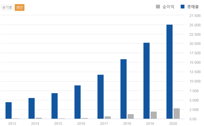 매출액과 영업이익은 해마다 늘고 있는데, 현재 러시아 가입자의 이탈과 지난해 4분기와 비교해 올해 1분기 유료 회원이 20만명 줄어 주가가 폭락하는 상황이 되고 있습니다.
