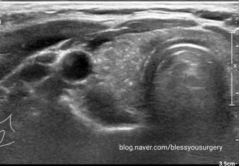 45세 여성의 건강검진상 우연히 발견된 오른쪽 갑상선 미세석회 초음파 사진입니다결절형이 아닌 우측 갑상선 전체에 퍼져 있는 백사립과 같은 미세한 미세석회화에서 세침검사를 실시하여 검사 결과 갑상선 유두상암 진단을 받았습니다.