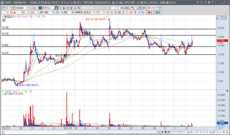 차트상에서는 크게 보아 14000원~20000원에서의 등락이 반복되고 있어, 지금의 주가는 박스권의 중간에 위치하고 있다고 말할 수 있습니다.