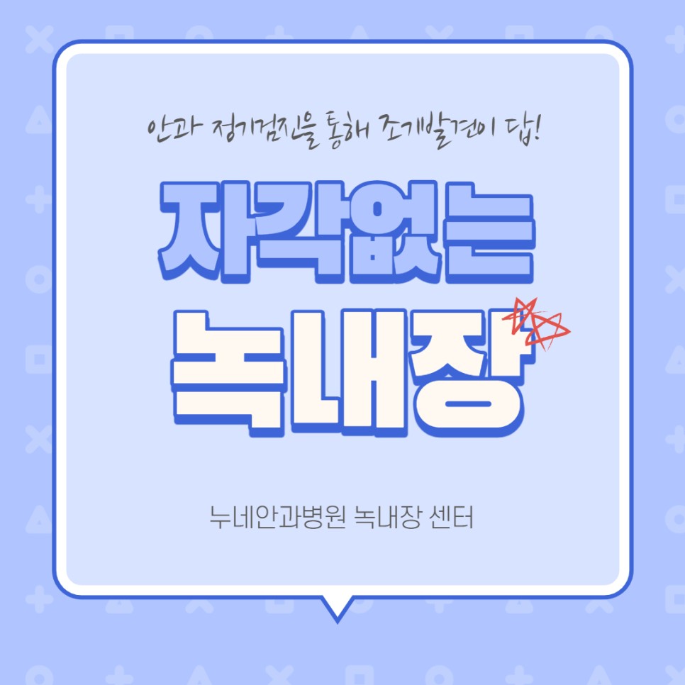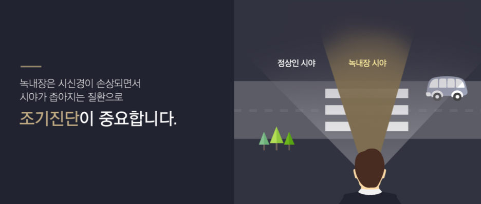 이때 노인성 안과 질환(녹내장, 백내장, 황반변성 등)이 동시에 발병하므로 유의하여 주십시오. 최근 스마트폰과 컴퓨터 등의 사용량 증가로 노안증세가 나타나는 연령층도 30~40대로 점차 낮아지고 있어 정기적인 안과 검진과 녹내장 관리에 대한 인지가 필요합니다.https://youtu.be/6MNRAYC8vZI 보통 녹내장을 진단받는 가장 일반적인 경로는 안과에서 우연히 발견된 경우가 가장 많으며, 건강검진에서 발견되는 경우 녹내장 관련 증상으로 발견되는 경우 가족력으로 발견된 경우이고, 관련 증상과 관계없이 안과 진료와 건강검진으로 우연히 녹내장 진단을 받은 환자들이 많을 것으로 사료됩니다.