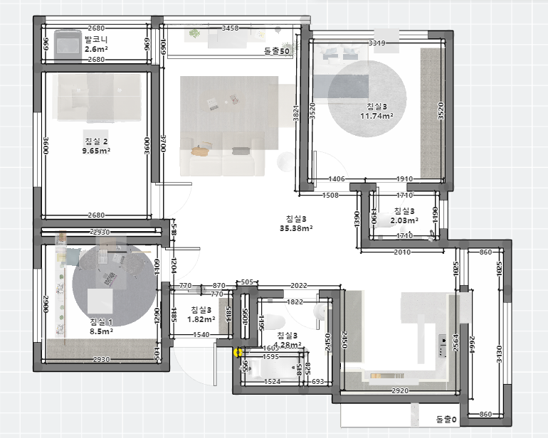 기존에는 몰딩과 우물천장, 창틀, 걸레받이가 체리컬러로 되어 있었습니다.3D 이미지