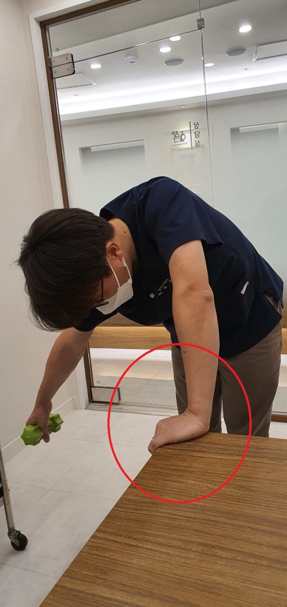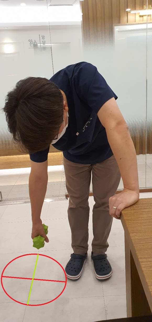 우측 오십견 환자의 경우, 표시된 바와 같이 왼쪽 손을 책상에 받쳐 체중을 싣고 오른팔을 늘어뜨린 후 손에는 1kg 내외의 아령(또는 무거운 물건)을 잡습니다. 팔의 가동 범위가 인정되는 크기로 추 운동을 해 주세요. 이때 어깨 부분의 자극이 될 정도의 범위까지 회전 반경을 넓히면 좋습니다. 이 운동은 반드시 오른쪽 어깨를 느슨하게 한 상태에서 해 주십시오.