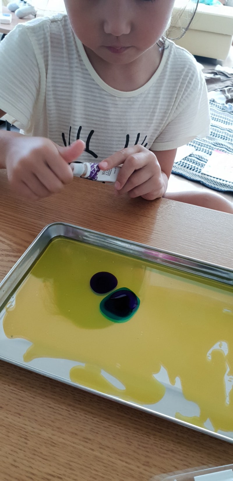이건… 무려 한 달 전쯤 w여름방학이 시작된 지 얼마 안 된 날에 내가 그래도 에너지(여름방학을 알차게 보내야 해!) 뿡뿡이가 있었을 때라 가능했던 놀이라는 걸 미리 적어본다.이소에서 마블링 물감 2세트(2천원씩 4천원)를 사서 바닥에 김장비닐 2개를 연결하고 용기는 분리수거하는 곳에서 적당한 것을 골라 가져왔다.애들은 묻어도 되는 걸 입히면 준비 끝!소지품 : 다이소인 마블링 물감, 도화지, 바닥에 깔린 비닐, 물티슈, 나무젓가락, 더러워져도 되는 옷매무새