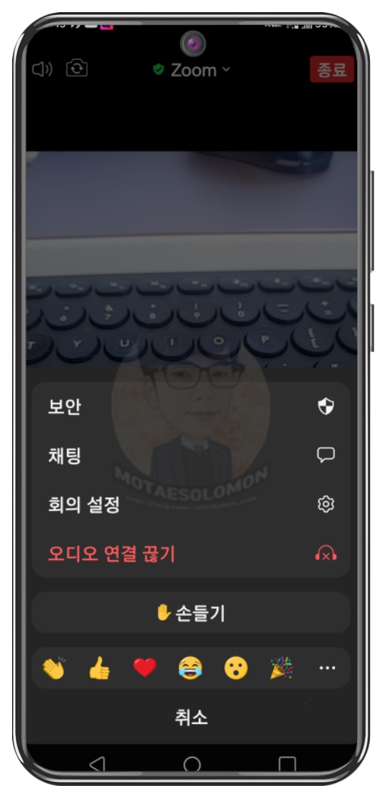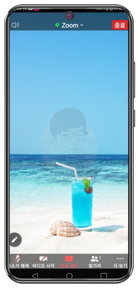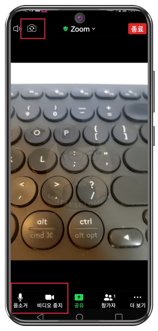 만약 본인의 얼굴 상태가 좋지 않다면 하단의 빨간색으로 표시된 [비디오 중지] 를 클릭하여 얼굴을 가릴 수 있습니다. 목소리가잠긴상태라면소음버튼을적극활용하는것이좋습니다. 왼쪽 상단에는 휴대전화 카메라의 앞뒤면을 전환하는 버튼이 있습니다. 공장에 기계가 돌아가는 장면을 조금만 보여주고, 카메라로 전환해서 내 얼굴을 보여주는 식의 현장감 있는 회의도 가능합니다.