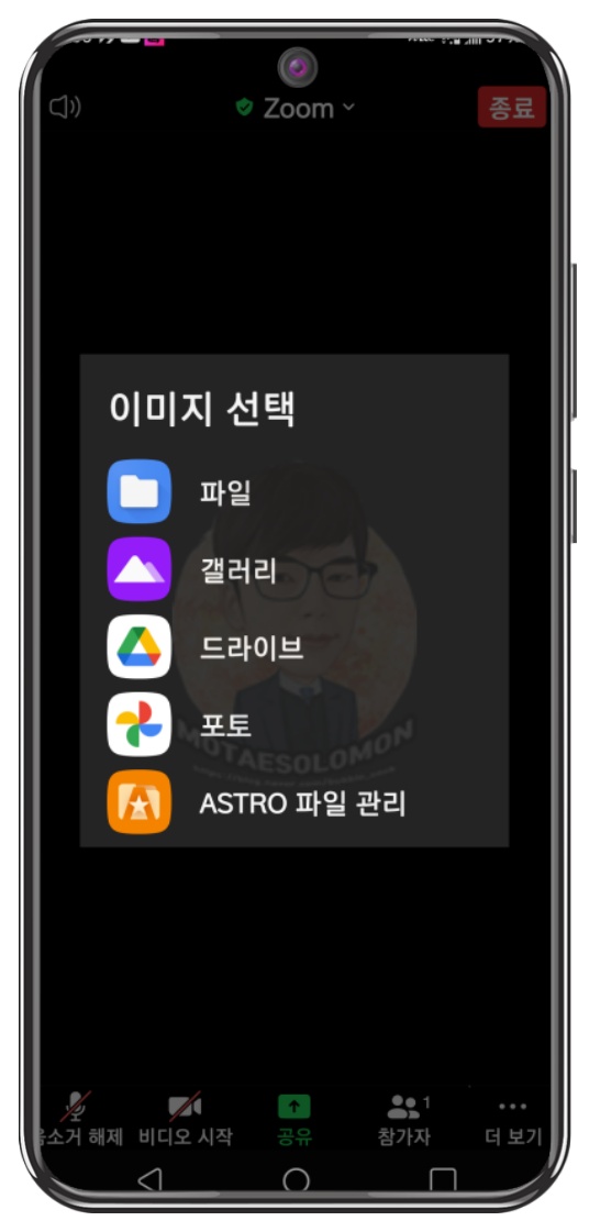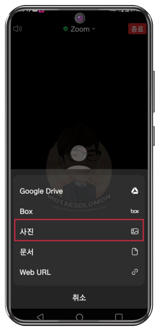 그리고 줌 배경화면 설정도 자유롭게 할 수 있어요 [사진] 메뉴를 이용하면 현재 사용하고 있는 스마트폰 갤러리에 저장된 사진을 zoom 배경화면을 설정할 수 있습니다. 인터넷 서핑을 해서 좋은 사진을 발견하고 저장해 둔 것도 지정이 가능합니다.