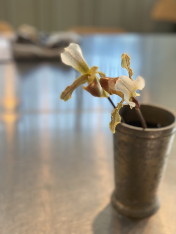 다행히 늦지 않게 도착해 자리에 앉으니 4시간 가까운 거리에서 조금 피로가 풀렸는데 테이블에 놓여 있는 꽃 한 송이, 프린트, 가위가 마음을 설레게 한다.