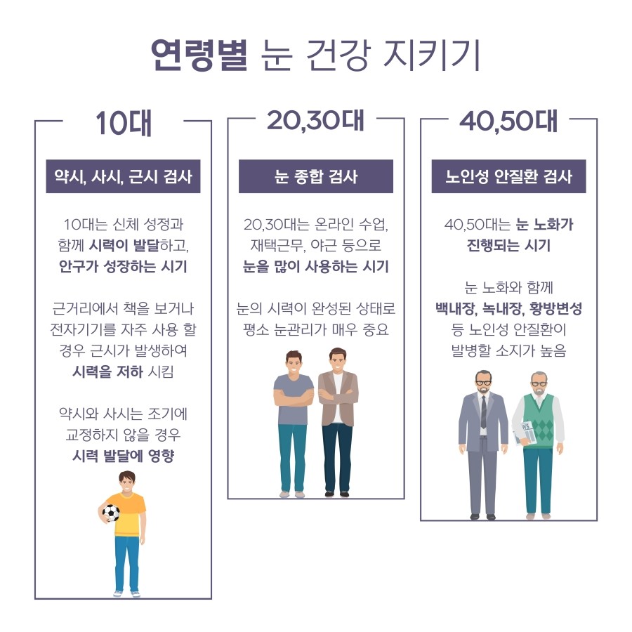 또 노화가 시작되는 40대 노인들은 신체 노화가 진행되면서 노안&노인성 안질환에 걸릴 확률이 높아집니다.정기검사를 계속하여 질병의 유무를 확인하고 기본을 지켜두면 큰 질병을 예방할 수 있어요.