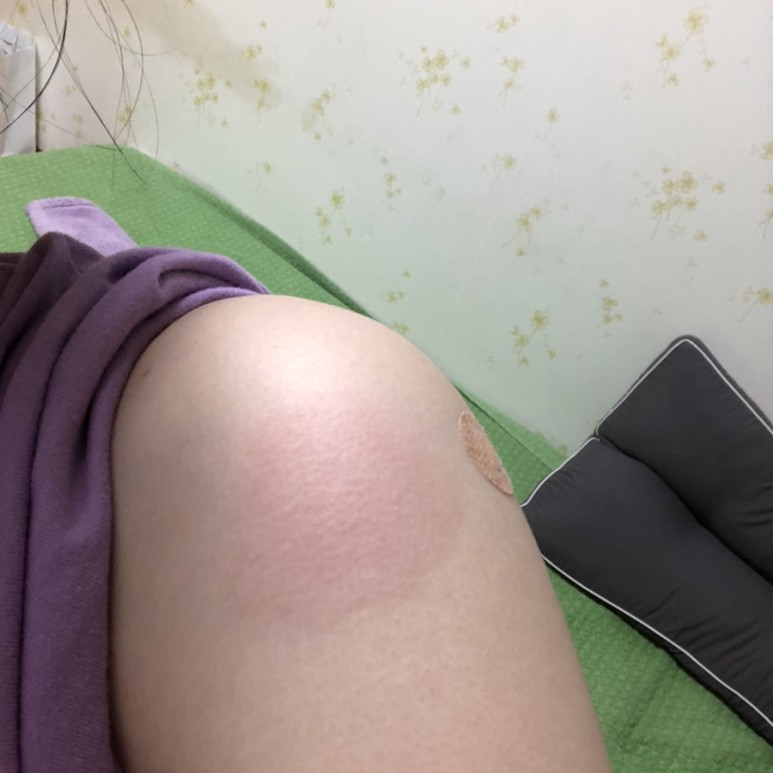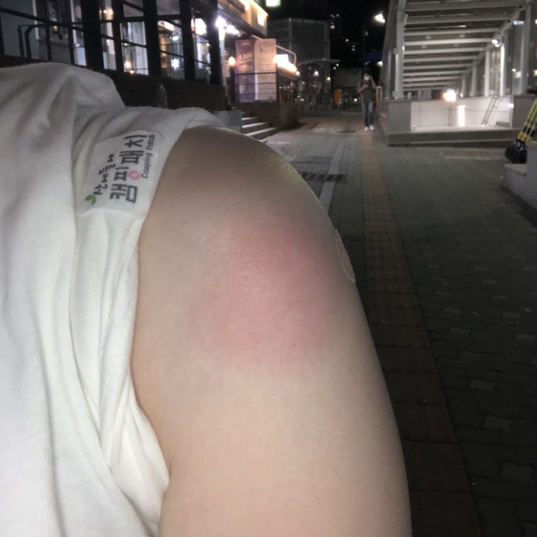 그 다음날 9/19발 빨간색이 더 심해져서 너무 가려웠어….저 부위에서만 엄청 열이 오르고 근육통이 발생TT!!!!!!!!!