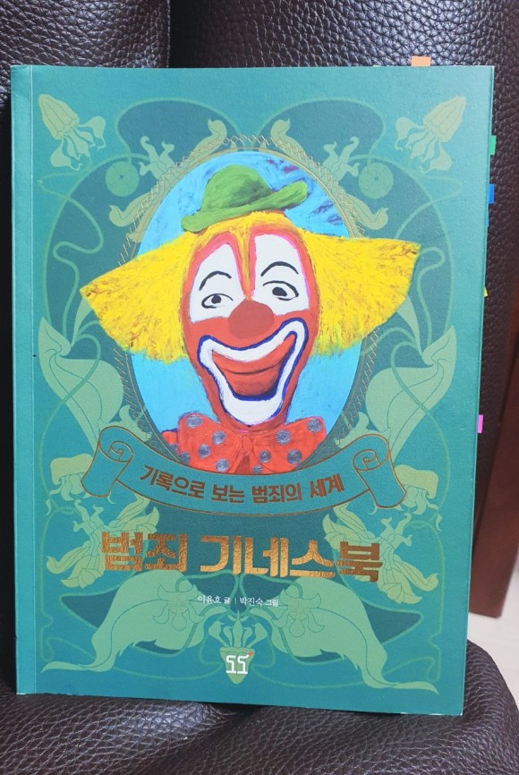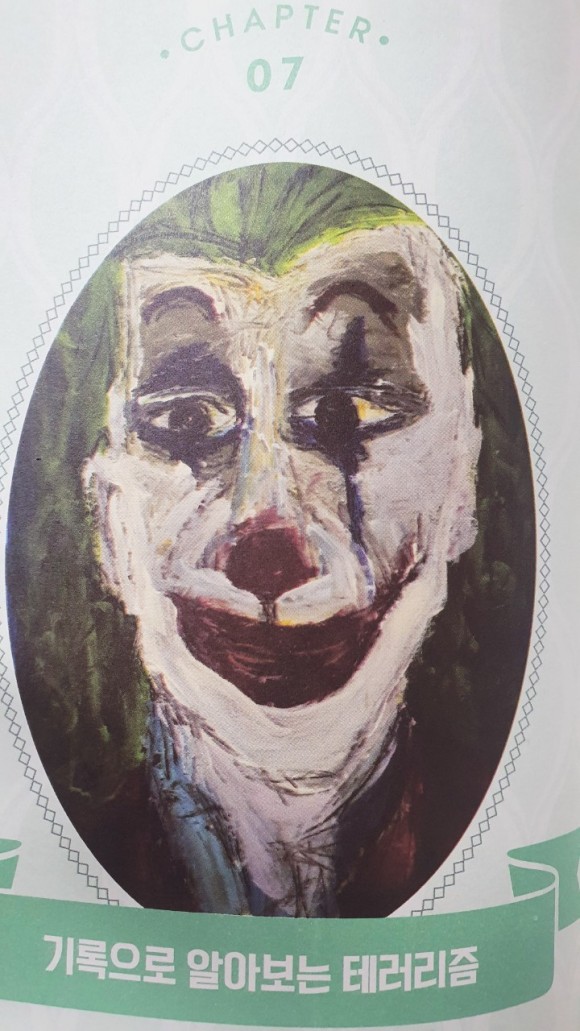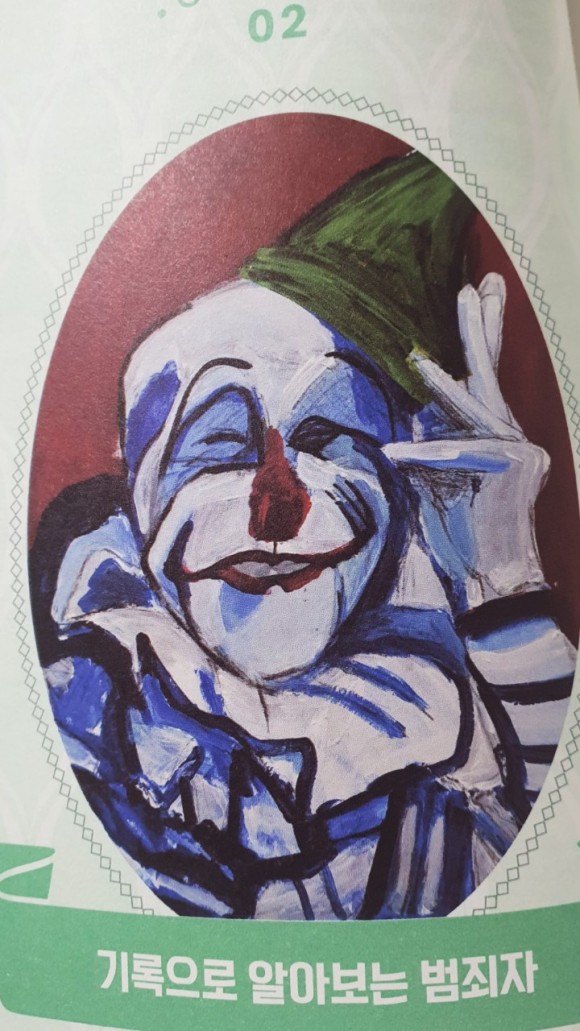 짙은 녹색 표지에는 오렌지색 피부에 노란 머리카락을 가진 어릿광대가 그려져 있다. 책을 읽기 전에는 우스꽝스러운 어릿광대로 느껴졌지만 범죄 백과사전 같은 이 책을 읽고 난 뒤 표지는 그리고 챕터마다 그려진 다양한 어릿광대들의 모습은 좀 괴기하게 느껴졌다. 아마 영화 조커의 영향인가 싶지만 책에 실린 다양한 범죄에 대한 설명으로 마음이 어수선했기 때문인 것 같다.