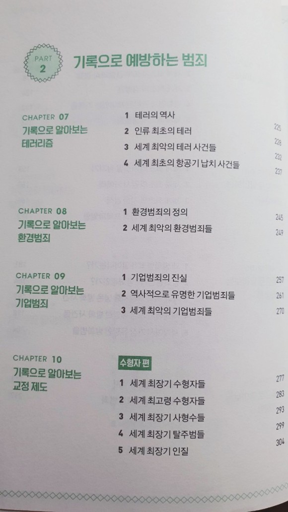 전쟁을 일으키는 원인인 종교와 이념에 따른 테러사건은 글자만 읽어도 끔찍할 정도였다.911사건 이전부터 납치사건이 빈번했던 게 신기했다. 기업범죄나 환경범죄자는 정말 항상 사람을 화나게 만드는 것 같아.