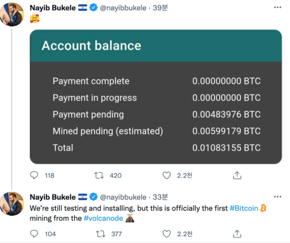 나이브 부케레 엘살바도르 대통령이 마침내 화산의 지열발전으로 채굴한 비트코인을 공개했다. 아직 테스트와 설치 중이지만 공식적으로 화산의 지열발전으로 채굴한 최초의 비트코인을 인증했다.