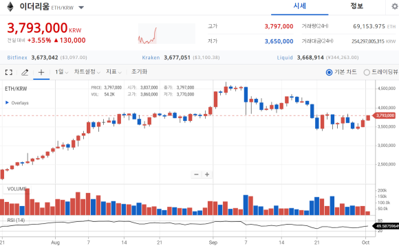 이더리움의 흐름도 좋다. 오히려 상승률로만 보면 계속 비트코인을 웃돌고 있는 상황이다. 3천달러를 넘어서면서 다행히 다시 상승 랠리를 할 것이라는 기대감을 높였다. 여기에 이더리움 2.0으로 만들기 위한 하드포크가 10월 중으로 예정돼 있어 전망이 좋다.