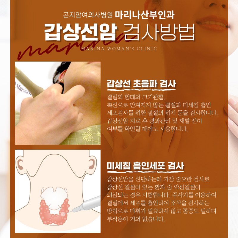 암으로 인해 일상 생활에서 작은 변화가 생기지만 대부분 대수롭지 않게 검사나 치료시기를 놓쳐 질병을 악화시키는 경우도 있습니다.놓치지 않기 위해서는 정기적으로 검사를 실시하여 자신의 몸 상태를 제대로 하는 것이 좋습니다만.여성을 대표하는 암의 하나라 할 수 있는 질환이기도 하며 갑상선 호르몬은 임신을 유지하고 태아의 뇌 및 신경 발달에 매우 중요한 호르몬이라는 의심이 있다면 부인과 전문의가 함께 상주하고 있는 곤지암 여의사병원을 방문하여 부인과 진료를 받으시는 것이 중요합니다.우선 갑상선암을 진단하기 위해서는 주로 초음파 검사를 먼저 실시하여 결절의 형태와 크기, 위치 등을 확인하고 결절이 있는 환자 중 악성 결절이 의심되는 경우 미세침 흡인세포 검사를 실시하게 됩니다.미세침 흡인 세포검사는 갑상선암을 진단하는데 가장 중요한 부분으로 주사기를 이용하여 세포를 흡인하여 조직을 검사하는 방법입니다.마취가 필요 없고 통증도 없기 때문에 부담없이 검진을 할 수 있습니다.