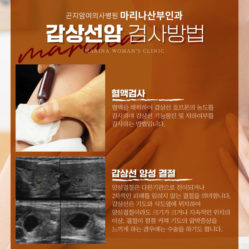 신체이상 증상을 조기에 발견하고 치료하기 위해서는 주기적인 건강검진을 받는 것이 중요한 만큼 장기적으로 안심하고 오랫동안 내원할 수 있는 마리나 곤지암 여의사병원을 찾아 진료를 보는 것도 좋은 대안이 될 것입니다.마리나는 내과, 산부인과, 소아과, 동네과 전문 의료진이 상주하고 있는 곳이기 때문에 여성의 발병률이 높은 갑상선암을 진료하기에 좋은 환경이 조성되어 있습니다.갑상선 호르몬은 부인과적인 부분에서도 큰 영향이 나오므로, 부인과 진료를 함께 할 수 있는 장소에서 진행해 봅시다.대학병원급의 최첨단 장비로 정확한 진단과 결과를 받을 수 있도록 시행하고 있는 만큼, 안심하고 내원하여 빨리 건강을 되찾을 수 있는 시간을 가졌으면 좋겠습니다.