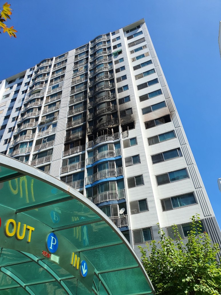 현장에 도착해서 아파트를 올려다보니 누가 시키지 않아도 상황이 좋지 않았다는 것을 한눈에 확인할 수 있었습니다.중산층에서발생한화재로그윗집은큰피해를입을수밖에없었는데